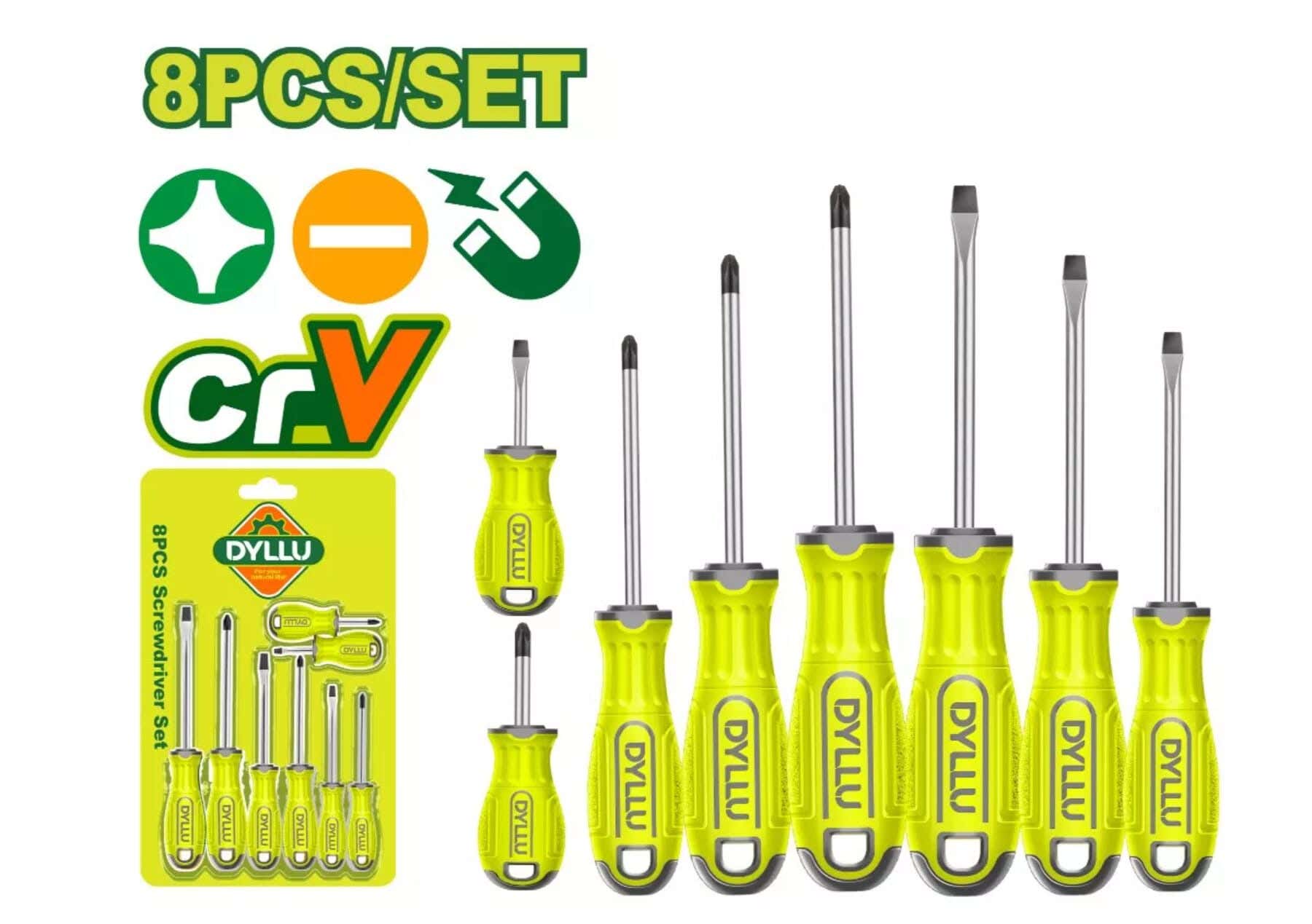 يحتوي الطقم على 4 مفكات عادة (رأس مسطح Slotted) و 4 مفكات صليبة (Phillips) بمقاسات مختلفة: