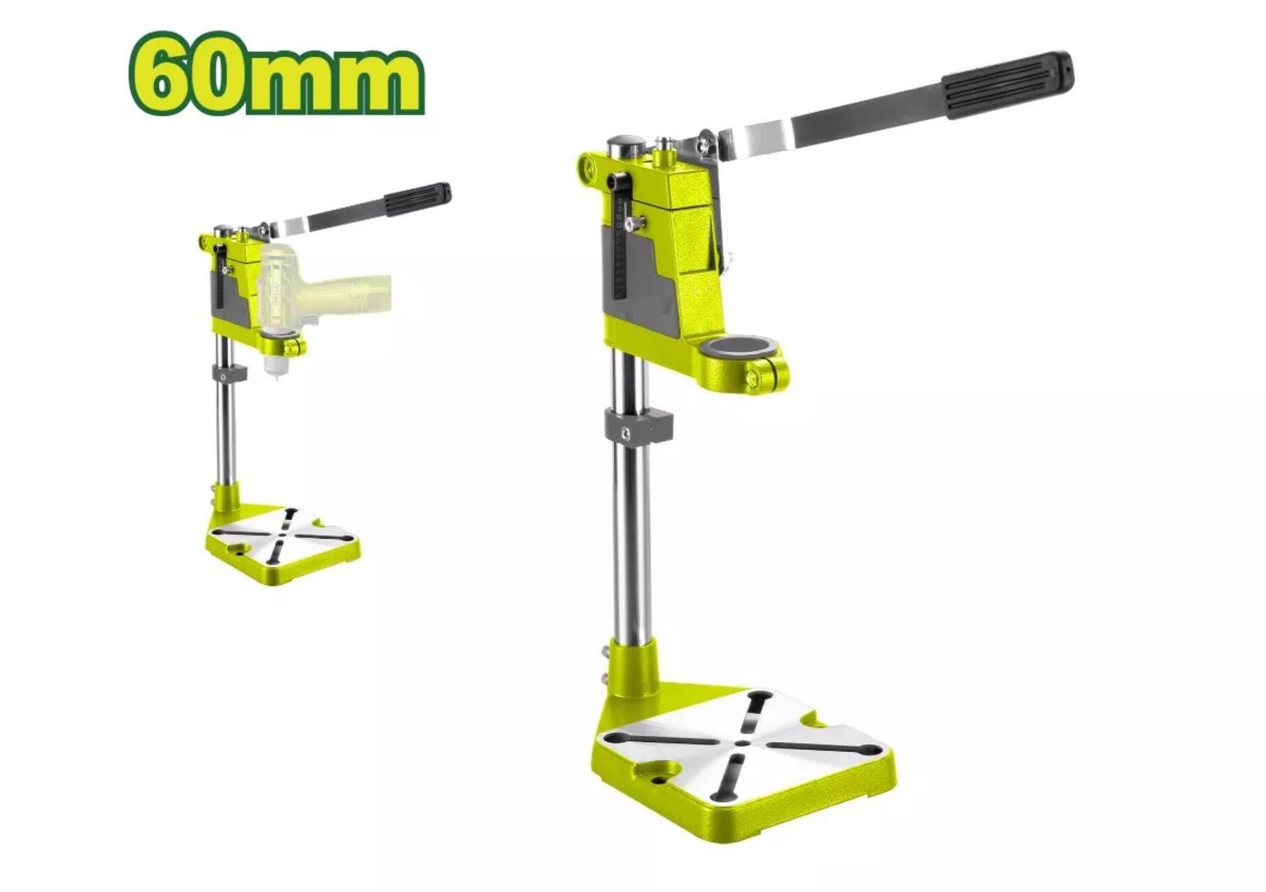 سعة تثبيت الدريل: مصمم لاستيعاب الدريلات بقطر يصل إلى 43 ملم (أو أحياناً يُذكر كـ 60 ملم في بعض القوائم التجارية كحجم قاعدة).