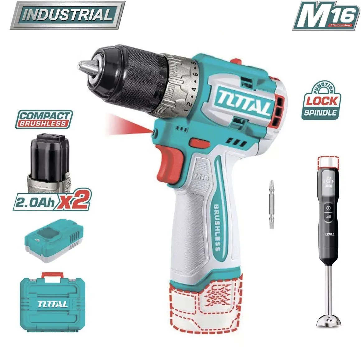 مثقاب/شنيور لاسلكي بجهد 16 فولت وعزم دوران 60 نيوتن متر (يتميز بمحرك بدون فرشاة، وسرعة تصل إلى 0-2000 دورة في الدقيقة، وظرف معدني 13 مم).